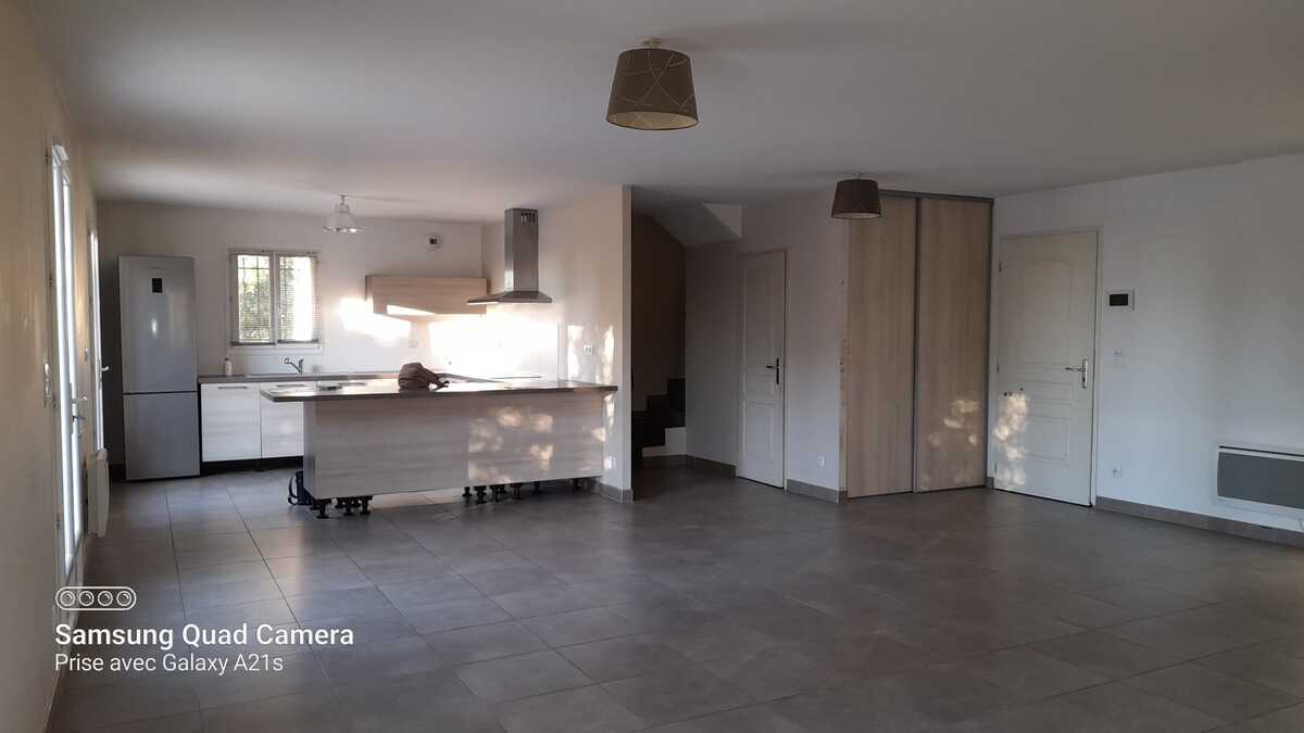 D’une surface habitable de 133 m² répartie sur deux niveaux, elle se compose au rez-de-chaussée d’une cuisine aménagée et équipée ouverte sur un vaste séjour lumineux, de toilettes, d’un débarras et d’un garage.