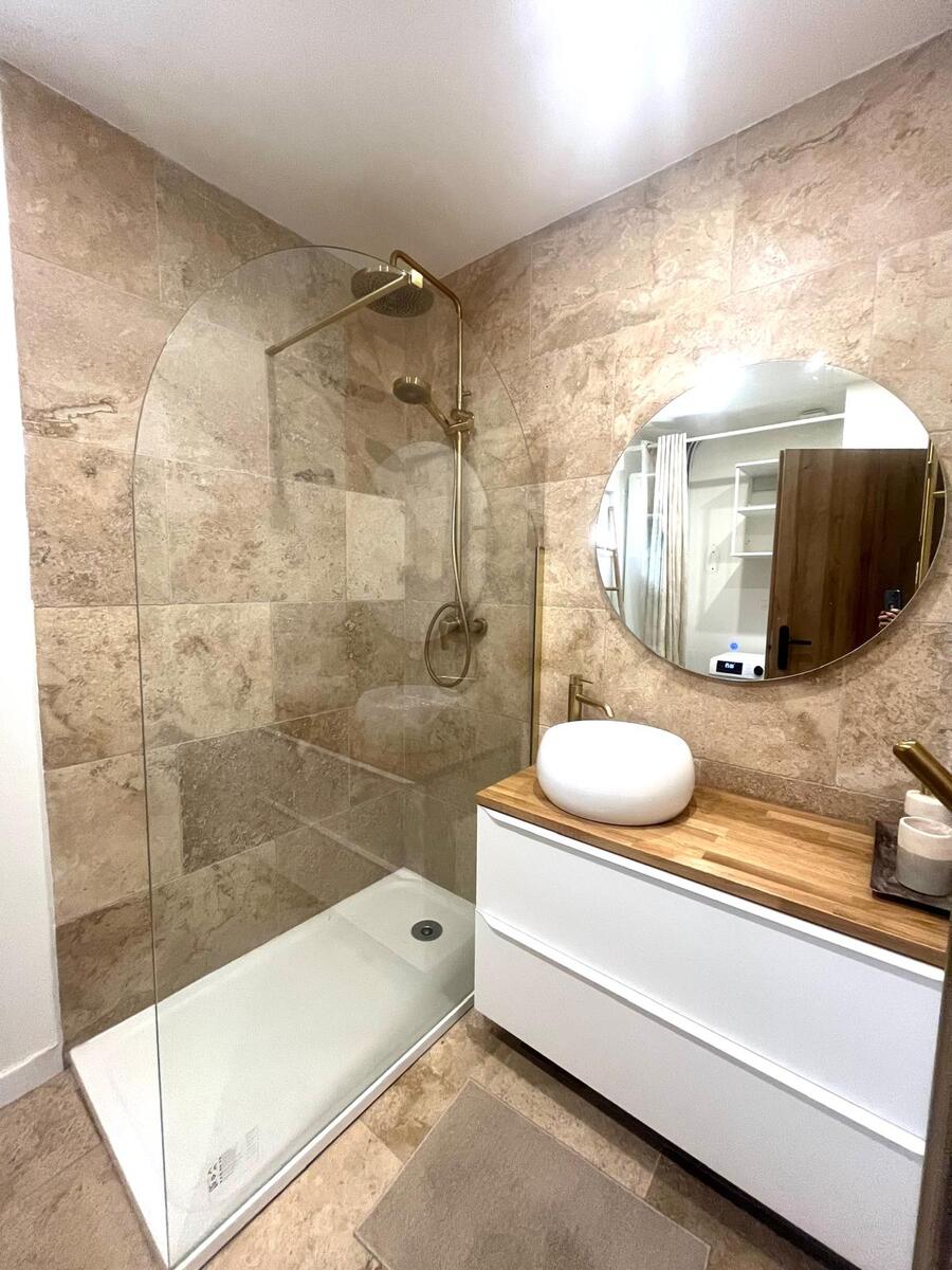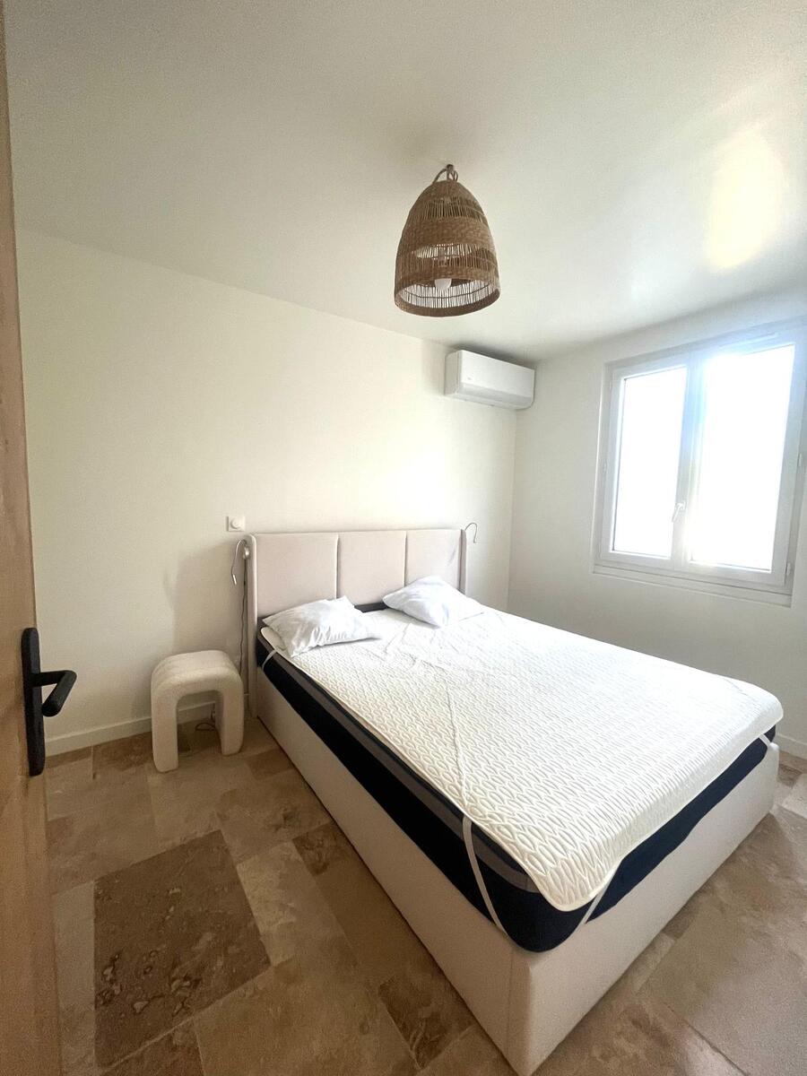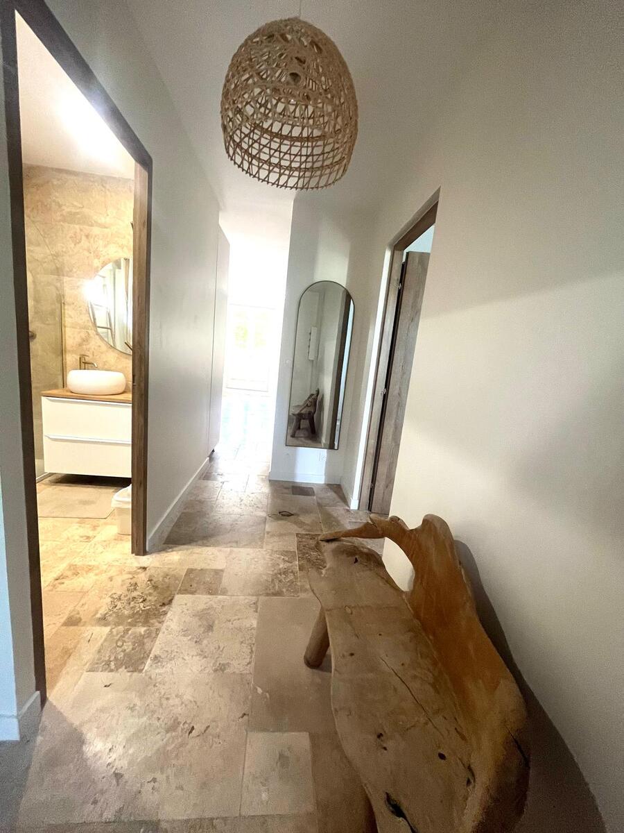 Doubles vitrages pour une meilleure isolation thermique et phonique, climatisation réversible dans chaque pièce pour un confort optimal et une Cuisine / salle d’eau neuves et modernes, travertin au sol .