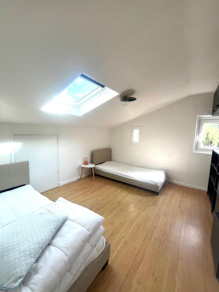 À l’étage on trouve deux chambres lumineuses +un grenier de plus de 21m2